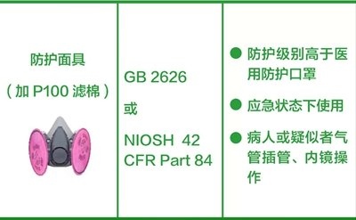 防護面具(加P100濾棉):防護級別高于醫(yī)用防護口罩,建議用于確診或疑似病例的氣管插管、內(nèi)鏡等操作。(橫列為口罩的圖片+名稱、產(chǎn)品標準、建議應用場景。圖片來源:中國疾控中心)