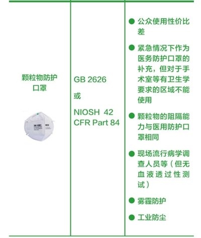 工業(yè)防顆粒物口罩:顆粒物的阻隔能力與醫(yī)用防護口罩類似,可用于工業(yè)防塵和霧霾防護。由于該類口罩無血液透過性測試,不推薦公眾佩戴,也不能用于手術(shù)室等有衛(wèi)生學要求的區(qū)域。(橫列為口罩的圖片+名稱、產(chǎn)品標準、建議應用場景。圖片來源:中國疾控中心)