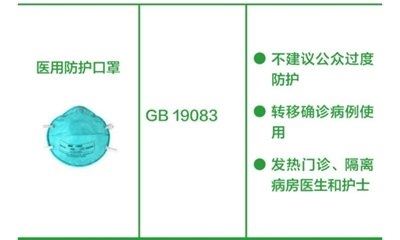 醫(yī)用防護口罩:推薦發(fā)熱門診、隔離病房醫(yī)護人員,以及確診新型冠狀病毒感染患者轉(zhuǎn)移使用。資源缺乏時,不建議公眾過度防護,可留給一線醫(yī)護人員使用。(橫列為口罩的圖片+名稱、產(chǎn)品標準、建議應用場景。圖片來源:中國疾控中心)