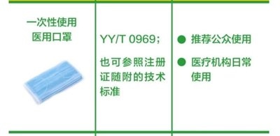 一次性使用醫(yī)用口罩:推薦公眾和醫(yī)療機構(gòu)的日常使用。(橫列為口罩的圖片+名稱、產(chǎn)品標準、建議應用場景。圖片來源:中國疾控中心)