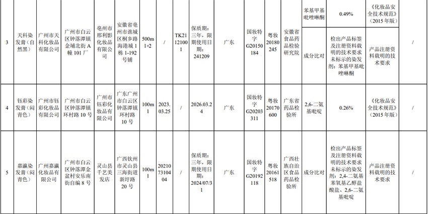 人民網(wǎng)北京9月5日電 (記者孫紅麗)國(guó)家藥監(jiān)局近日發(fā)布通告,在2023年國(guó)家化妝品抽樣檢驗(yàn)工作中,經(jīng)重慶市食品藥品檢驗(yàn)檢測(cè)研究院等單位檢驗(yàn),產(chǎn)品標(biāo)簽標(biāo)示為廣州市天科化妝品有限公司生產(chǎn)的天科染發(fā)膏(自然黑)等23批次化妝品不符合規(guī)定。