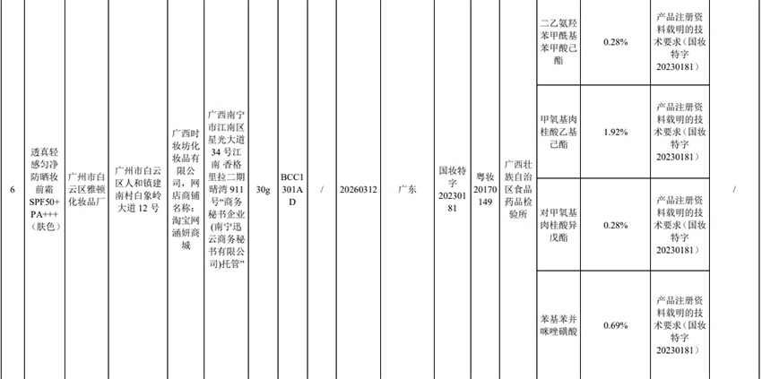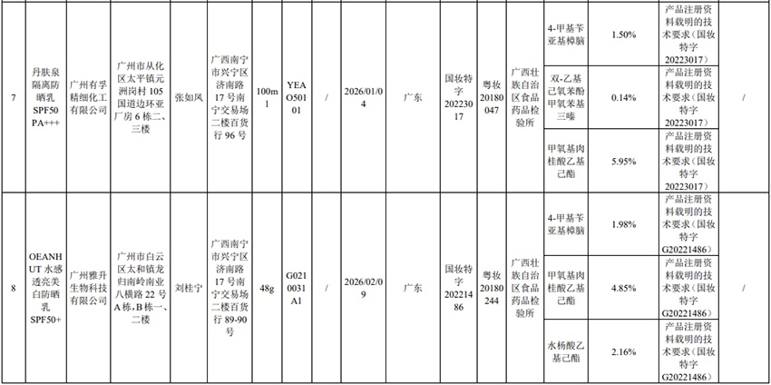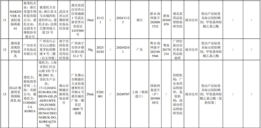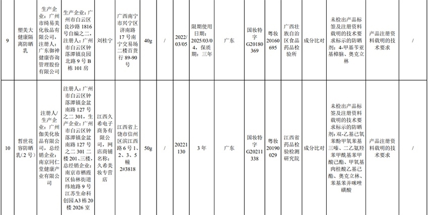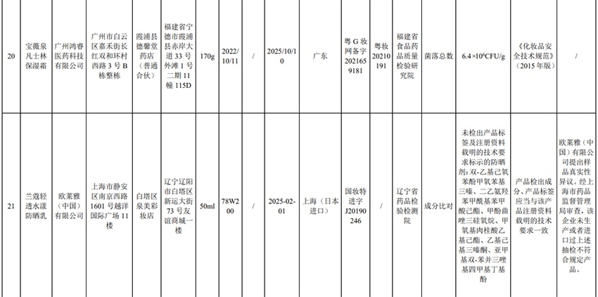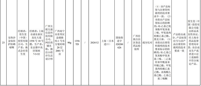 記者注意到,其中,產(chǎn)品標(biāo)簽標(biāo)示為歐萊雅(中國(guó))有限公司生產(chǎn)的蘭蔻輕透水漾防曬乳(標(biāo)示批號(hào):78W200)“未檢出產(chǎn)品標(biāo)簽及注冊(cè)資料載明的技術(shù)要求標(biāo)示的防曬劑”;產(chǎn)品標(biāo)簽標(biāo)示為朋友(上海)化妝品銷(xiāo)售有限公司進(jìn)口的普柔瑪絲特染發(fā)膏(配合普蓉斯綈雙氧乳)(標(biāo)示批號(hào):7X15)“檢出產(chǎn)品標(biāo)簽及注冊(cè)資料載明的技術(shù)要求未標(biāo)示的染發(fā)劑”;產(chǎn)品標(biāo)簽標(biāo)示為資生堂(中國(guó))投資有限公司經(jīng)銷(xiāo)的安熱沙金燦倍護(hù)防曬啫喱(標(biāo)示批號(hào):1356TD)“產(chǎn)品標(biāo)簽與注冊(cè)資料載明的技術(shù)要求不一致”、“未檢出產(chǎn)品標(biāo)簽標(biāo)示的防曬劑”、“未檢出注冊(cè)資料載明的技術(shù)要求標(biāo)示的防曬劑”。