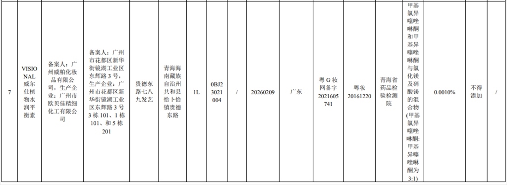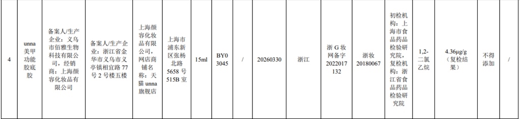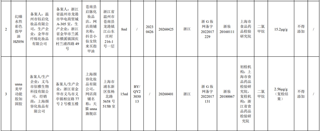 根據(jù)通告,在2023年國家化妝品抽樣檢驗工作中,經上海市食品藥品檢驗研究院等單位檢驗,產品標簽標示委托方為溫州市鈺啟化妝品有限公司、受托生產企業(yè)為金華市纖爍化妝品有限公司生產的幻臻水性彩色指甲油HZ088等7批次化妝品不符合規(guī)定,檢出《化妝品安全技術規(guī)范(2015年版)》中規(guī)定的禁用原料。