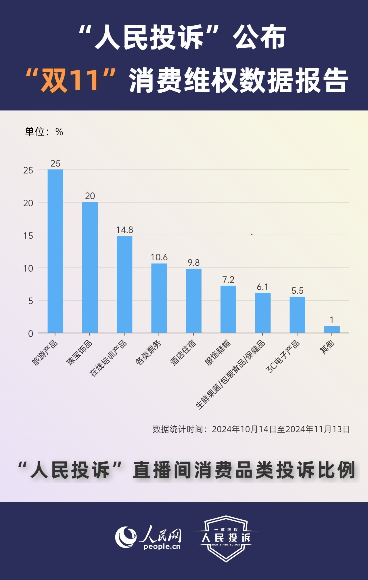 今年“雙11”前夕,人民網(wǎng)“人民投訴”平臺(tái)聯(lián)合人民日?qǐng)?bào)“讀者來信”版發(fā)起規(guī)范“直播帶貨”問題建議征集活動(dòng)。平臺(tái)數(shù)據(jù)顯示,活動(dòng)上線以來,網(wǎng)友通過各渠道的相關(guān)留言量已超千條?!叭嗣裢对V”分析發(fā)現(xiàn),網(wǎng)友投訴直播消費(fèi)多集中在預(yù)付費(fèi)式旅游產(chǎn)品、在線培訓(xùn)產(chǎn)品、珠寶飾品、服裝鞋帽、電子產(chǎn)品、生鮮食品、酒店服務(wù)、娛樂演出票務(wù)、寵物買賣等消費(fèi)品類。其中,旅游套餐投訴占比25%,珠寶飾品交易投訴占比20%,在線培訓(xùn)投訴占比14.8%,各類票務(wù)投訴占比10.6%,酒店住宿投訴占比9.8%,服飾帽類商品投訴占比7.2%,生鮮果蔬/包裝食品/保健品投訴占比6.1%,3C電子產(chǎn)品投訴占比5.5%。