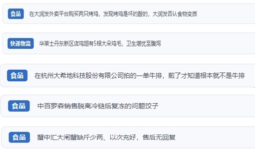 “人民投訴”上不少網(wǎng)友反映,“外賣(mài)商家銷(xiāo)售排骨套餐中含過(guò)期飲料”“外賣(mài)店鋪吃出蟑螂,商家不按照食品安全法賠償” “直播間購(gòu)買(mǎi)車(chē)?yán)遄?,虛假宣?J、原裝進(jìn)口,到貨嚴(yán)重貨不對(duì)板”“網(wǎng)購(gòu)東北珍珠貢米,到貨包裝上執(zhí)行標(biāo)準(zhǔn)是廢止的標(biāo)準(zhǔn)”“超市買(mǎi)的梅花肉切開(kāi)發(fā)現(xiàn)是淋巴肉”“平臺(tái)商家承諾枸杞不熏硫酸,實(shí)則檢測(cè)后含硫超標(biāo)”“知名便利店售賣(mài)脫離冷鏈后多次復(fù)凍的餃子”等。