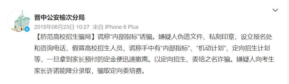 每年各省市投檔分數(shù)線公布后,總是“幾家歡喜幾家愁”,不法分子也在此刻瞄準了落榜考生。根據(jù)各地公安部門通報,一些不法分子假冒高校招生人員或聲稱“熟悉”高校招生辦,點對點與相關(guān)考生取得聯(lián)系。隨后謊稱有某高校的“內(nèi)部指標(biāo)”“機動計劃”,或是以“定向招生”“委培招生”等名義“降分錄取”考生,誘騙其繳納相關(guān)費用。需要注意的是,在實施這些詐騙行為時,不法分子往往使用電腦合成技術(shù)偽造“招生文件”“學(xué)校公章”等,騙取考生及家長的信任。