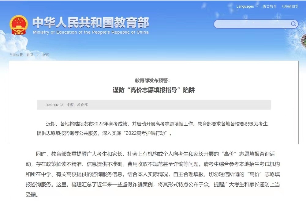 近日,教育部發(fā)布預(yù)警,提醒考生謹防“高價志愿填報指導(dǎo)”陷阱。有網(wǎng)站虛假宣傳擁有所謂“內(nèi)部信息”,自稱掌握內(nèi)部大數(shù)據(jù),能夠“精準定位院?!钡鹊?。事實上,每年高考填報志愿前,各省級招生考試機構(gòu)都會發(fā)布當(dāng)年高考成績統(tǒng)計情況和近年來各高校錄取分數(shù)情況,并不存在市面上的咨詢機構(gòu)或個人聲稱的“內(nèi)部信息”。還有一些咨詢機構(gòu)假冒所謂志愿填報專家身份。該咨詢機構(gòu)打出廣告,稱團隊的專家“獲得高考志愿規(guī)劃師認證”“來自著名高?!钡?。事實上,有關(guān)部門從未發(fā)放過“高考志愿規(guī)劃師”這類職業(yè)資格證書。該機構(gòu)一些所謂“志愿規(guī)劃師”都是臨時招募的社會人員,按照總部提供的“臺詞”給考生和家長輔導(dǎo)。家長購買這些機構(gòu)的服務(wù)不僅花了冤枉錢,而且可能報錯志愿?! ?/p>
