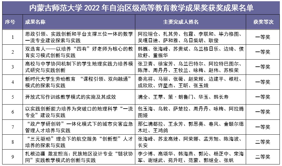 北疆新聞網(wǎng)、北疆新聞APP、北疆云消息(記者 李艷紅)近日,內(nèi)蒙古自治區(qū)教育廳發(fā)布了《關(guān)于公布2022年自治區(qū)級(jí)高等教育教學(xué)成果獎(jiǎng)獲獎(jiǎng)成果的通知》,內(nèi)蒙古師范大學(xué)微官網(wǎng)由數(shù)學(xué)科學(xué)學(xué)院牽頭、黨委書(shū)記阿拉坦倉(cāng)主持的《思政引領(lǐng)、實(shí)踐創(chuàng)新和平臺(tái)支撐三位一體的數(shù)學(xué)一流專業(yè)建設(shè)與實(shí)踐》等17個(gè)推薦至自治區(qū)的教學(xué)成果均獲獎(jiǎng),實(shí)現(xiàn)了100%的獲獎(jiǎng)率。其中,一等獎(jiǎng)7項(xiàng),二等獎(jiǎng)4項(xiàng),三等獎(jiǎng)6項(xiàng)。一等獎(jiǎng)獲獎(jiǎng)數(shù)量及總獲獎(jiǎng)率位居全區(qū)之首。