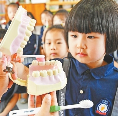 浙江省臺(tái)州市仙居縣迎暉幼兒園的小朋友正在學(xué)習(xí)正確的刷牙方法。 王華斌攝(人民視覺)