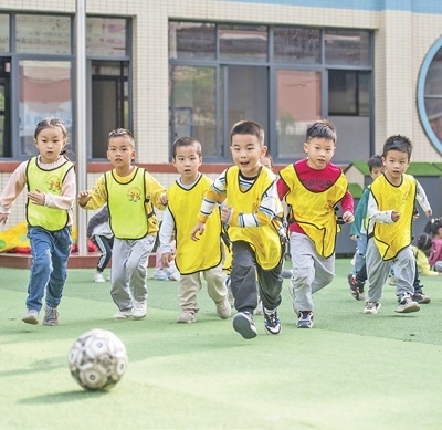 湖南省永州市道縣城東幼兒園,孩子們?cè)谔咦闱颉?蔣克青攝(人民視覺)