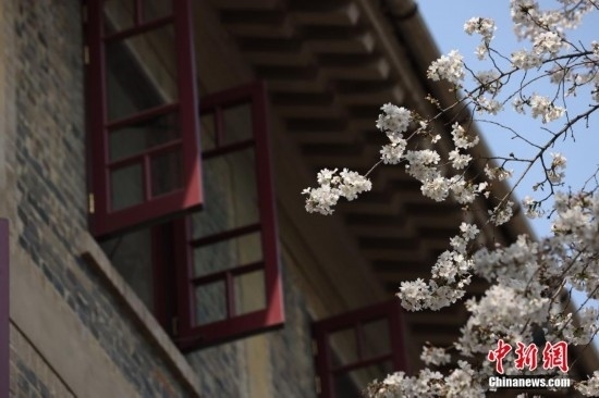 白色櫻花與朱紅色窗欞相呼應(yīng)。