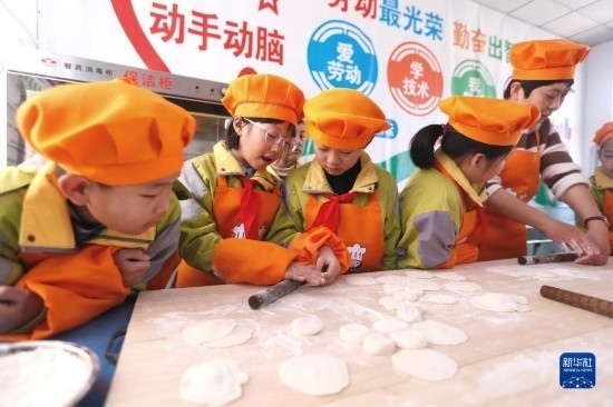 3月28日,青島市即墨藍谷高新區(qū)東皋埠小學的學生在“烹飪課堂”上學習搟餃子皮。