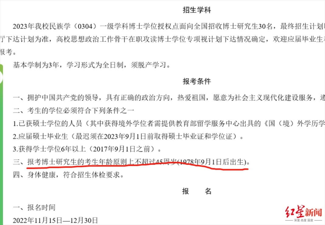 而根據(jù)《青海民族大學(xué)2023年民族學(xué)博士研究生招生簡(jiǎn)章》,報(bào)考博士研究生的考生年齡原則上不超過45周歲(1978年9月1日后出生)。資料顯示,阿進(jìn)錄為1973年出生。對(duì)于網(wǎng)友提到的“年齡不符合報(bào)考條件”,上述工作人員表示:“他資格審查是通過的?!?/strong>