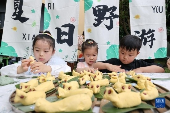 5月5日,浙江省湖州市德清縣三橋幼兒園的小朋友在捏立夏狗。