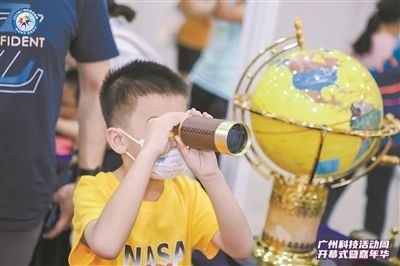 小學(xué)生使用望遠(yuǎn)鏡觀察物體。廣州科技活動(dòng)周主辦方供圖