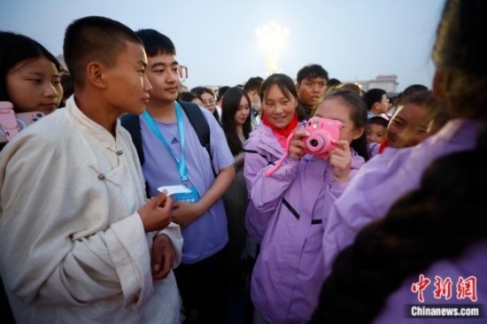 6月1日清晨的天安門廣場(chǎng),一群來自青海玉樹、身著傳統(tǒng)藏族服飾的孩子組成了一道亮麗的風(fēng)景線。