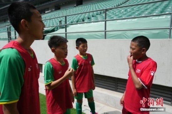 這是孩子們第一次在大型體育場(chǎng)上踢球。教練東周文德說,來北京前,孩子們問他,“C羅踢球的那種球場(chǎng)在哪?”“工體里面的草都是真草嗎?”