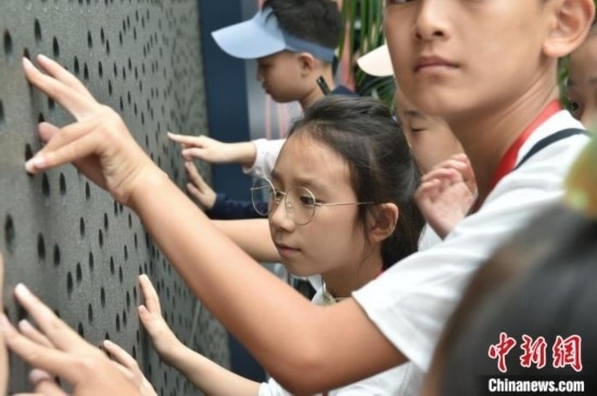 8月7日,學員用手觸摸國家大劇院內(nèi)的特色墻壁。中新社記者 李駿 攝