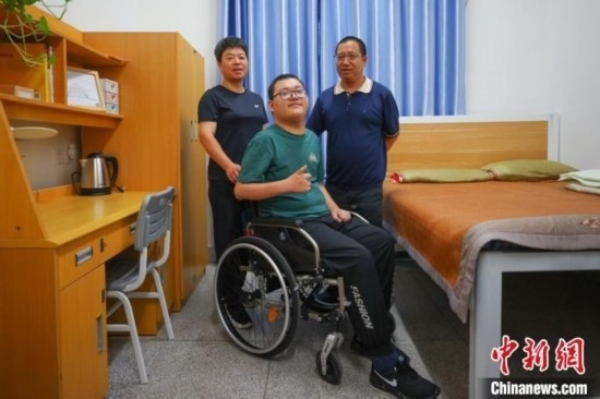 來自江蘇啟東的董亦超前來東南大學報到,坐在輪椅上的他在父母的陪同下入住宿舍。泱波 攝