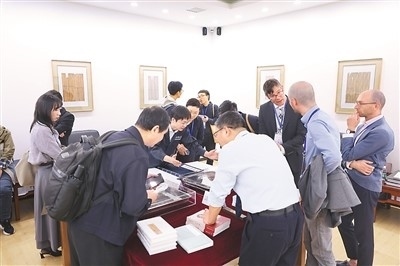 參加“古文字與中華文明”國際學術論壇的專家學者在參觀清華簡。