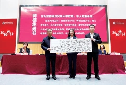 在加強(qiáng)思想政治建設(shè)方面,抓好思政課改革創(chuàng)新,在市屬高校率先全面開設(shè)“習(xí)近平新時代中國特色社會主義思想概論”課,獲批北京市首批重點(diǎn)建設(shè)馬克思主義學(xué)院。持續(xù)開展課程思政建設(shè),得到市委教育工委的肯定性評價。聯(lián)動社會大課堂,成立大學(xué)生思想政治教育中心,與北大紅樓、中國人民抗日戰(zhàn)爭紀(jì)念館、長辛店二七紀(jì)念館等單位共建一批“大思政課”實踐教學(xué)基地。堅持“五育并舉”,促進(jìn)學(xué)生全面發(fā)展。五年多來,學(xué)校獲評多項教育部和北京市課程思政建設(shè)獎項、北京高?!叭恕眱?yōu)秀成果、北京高?!笆演o導(dǎo)員”等榮譽(yù)。一批學(xué)生在文體比賽中獲省部級及以上獎勵,展現(xiàn)出新時代首經(jīng)貿(mào)學(xué)子的良好風(fēng)貌。