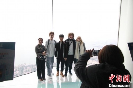 美國(guó)高校學(xué)生在青島海天中心城市觀光廳合影留念。王宇軒 攝