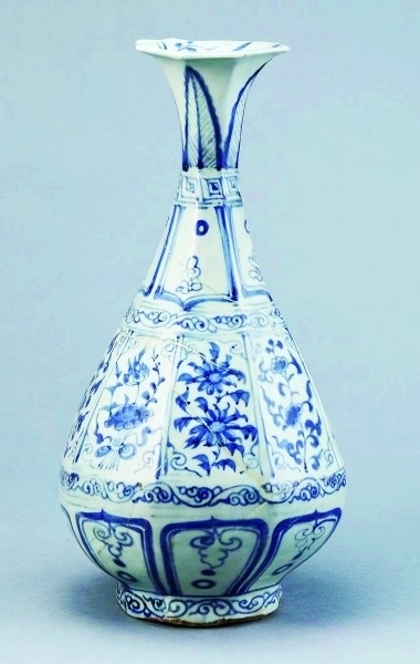 “北京大學藏古代外銷瓷”特展上的展品景德鎮(zhèn)窯青花折枝花卉紋八方玉壺春瓶。資料圖片