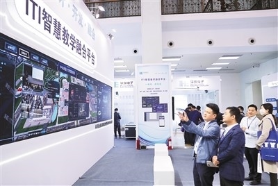 在第33屆(2024年)北京教育裝備展示會上,觀眾參觀智慧教學融合平臺。張秀科攝(人民圖片)