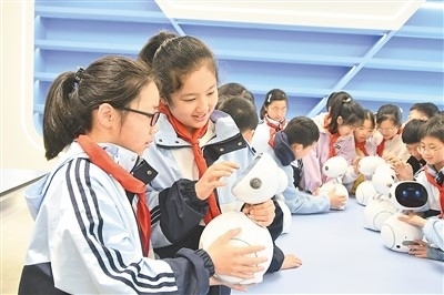 江西省上饒市廣豐區(qū)洋口中心小學人工智能教室里,學生們在老師的指導下開展人工智能科普課程。朱文標攝(人民圖片)