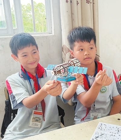 廣西壯族自治區(qū)貴港市平南縣廖村小學(xué)的學(xué)生在展示科普活動(dòng)作品。廣西科技館供圖