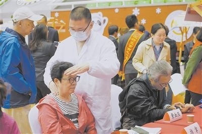 10月10日,2024年北京月壇街道重陽節(jié)為老服務(wù)市集活動(dòng)在月壇體育館舉行。北京中醫(yī)藥大學(xué)中醫(yī)學(xué)院的志愿者用自己所學(xué)的專業(yè)知識在市集上為老年人服務(wù)。圖為北京中醫(yī)藥大學(xué)中醫(yī)學(xué)院的志愿者在月壇體育館為老人服務(wù)。新華社記者 邢廣利攝
