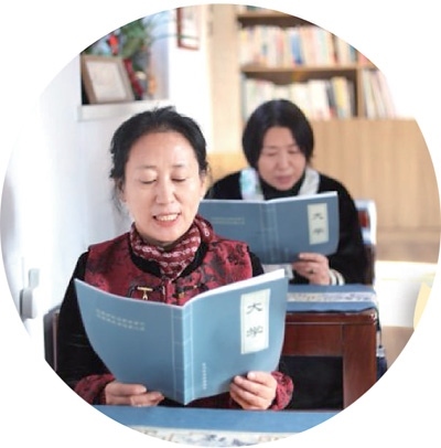 龍口市老年大學(xué)國學(xué)班的學(xué)員在課堂上誦讀《大學(xué)》。