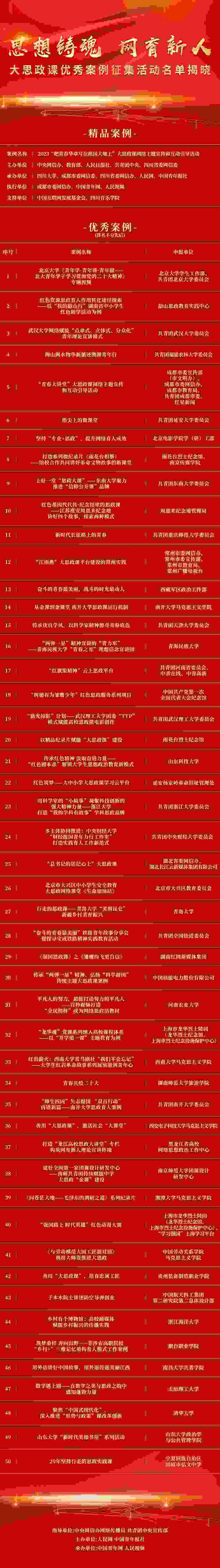 人民網(wǎng)北京2月10日電 (記者王鑫)由中央網(wǎng)信辦網(wǎng)絡(luò)傳播局、共青團中央宣傳部指導(dǎo),人民網(wǎng)、中國青年報社共同主辦的“思想鑄魂 網(wǎng)育新人”大思政課優(yōu)秀案例征集活動評選今天揭曉結(jié)果,經(jīng)初選、終選以及結(jié)果公示,產(chǎn)生精品案例1件、優(yōu)秀案例50件,名單如下: