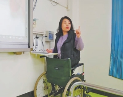 因?yàn)闊o(wú)法行走,王秀穎上課只能依靠輪椅。為了不影響教學(xué),她把輪椅滑到幻燈機(jī)前,跪在輪椅上,找到合適的高度,一邊講解,一邊演算、書寫。