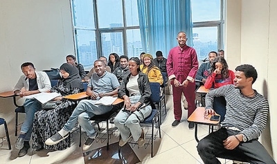 2021年,卡利布學(xué)成回到埃塞俄比亞,發(fā)現(xiàn)很多埃塞人有學(xué)習(xí)中文的需求,便開辦了“你好”中文學(xué)校。針對當(dāng)?shù)厝说陌l(fā)音和學(xué)習(xí)習(xí)慣,開發(fā)了阿姆哈拉語和中文雙語教材,在當(dāng)?shù)刂形慕逃I(lǐng)域獨(dú)樹一幟,吸引了上百名學(xué)員。這些學(xué)員不僅有即將赴中國留學(xué)的學(xué)生,還有與中國有生意往來的商人等。此外,卡利布教學(xué)內(nèi)容的一部分是教中國人學(xué)習(xí)阿姆哈拉語,旨在幫助大家更好地融入當(dāng)?shù)厣睢?/p>