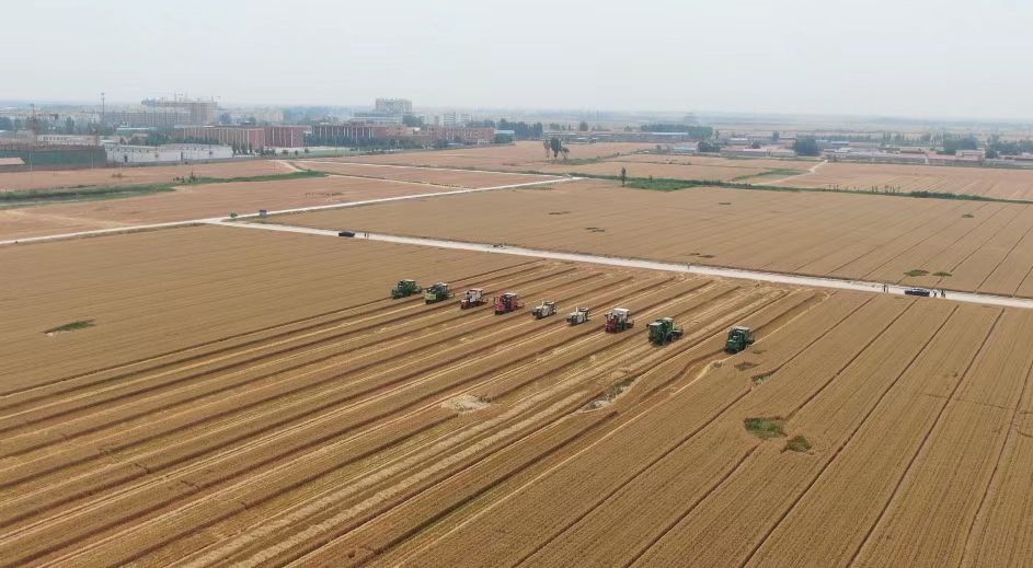 夏收時節(jié),在山東省德州市臨邑縣德平鎮(zhèn)大西關(guān)村的麥田里,幾臺收割機排成一排,轟隆隆地穿梭在金色的麥浪中。富民家庭農(nóng)場負(fù)責(zé)人魏德東指著剛收獲的小麥說:“畝產(chǎn)量將近1300斤,一畝地比往年增產(chǎn)了百十斤,不僅產(chǎn)量高,品質(zhì)也好。”