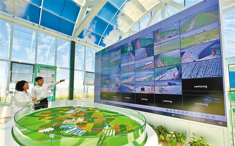 近日,巴彥淖爾市杭錦后旗二道橋鎮(zhèn)鄉(xiāng)村振興設(shè)施農(nóng)業(yè)產(chǎn)業(yè)園區(qū)工作人員正在記錄現(xiàn)代農(nóng)業(yè)數(shù)字平臺(tái)監(jiān)測(cè)數(shù)據(jù)。據(jù)悉,該園區(qū)占地2000畝,投資4600萬(wàn)元,是集智慧農(nóng)業(yè)管理、引黃滴灌示范、集中連片種植等多項(xiàng)功能為一體的現(xiàn)代農(nóng)業(yè)產(chǎn)業(yè)園區(qū)。通過(guò)現(xiàn)代農(nóng)業(yè)數(shù)字平臺(tái),進(jìn)行智能管控、農(nóng)產(chǎn)品質(zhì)量檢測(cè)、科技培訓(xùn)、遠(yuǎn)程科技指導(dǎo),同時(shí)讓更多的農(nóng)戶利用APP與平臺(tái)共享數(shù)據(jù)資源,實(shí)現(xiàn)田間自動(dòng)化管理。園區(qū)通過(guò)平臺(tái)智能管控,今年第一茬種植麒麟西瓜,第二茬計(jì)劃種植葉菜類,兩茬畝均效益預(yù)計(jì)在2萬(wàn)元以上。(記者 孟和朝魯 攝影報(bào)道)