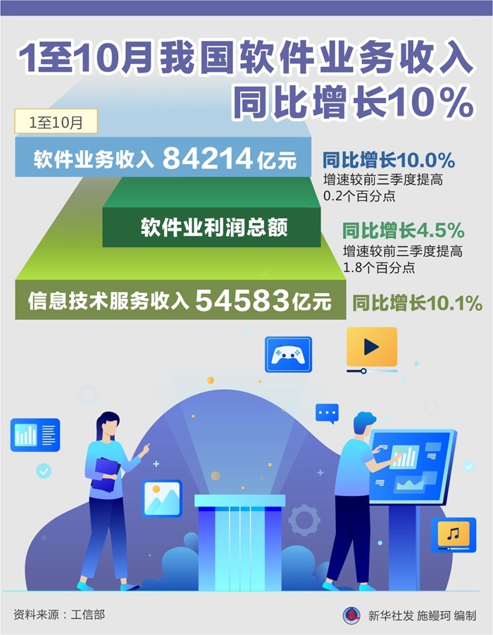 記者24日從工信部獲悉,1至10月,我國軟件和信息技術服務業(yè)運行態(tài)勢平穩(wěn)向好,軟件業(yè)務收入84214億元,同比增長10.0%,增速較前三季度提高0.2個百分點。