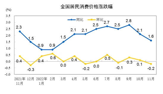 11月份,全國居民消費價格環(huán)比下降0.2%。其中,城市下降0.2%,農村下降0.2%;食品價格下降0.8%,非食品價格持平;消費品價格下降0.1%,服務價格下降0.2%。