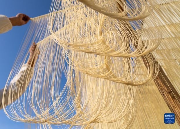 12月12日,在竹塘社區(qū)掛面合作社的掛面車間,工人將掛面上架晾曬。新華社發(fā)(阮雪楓 攝)