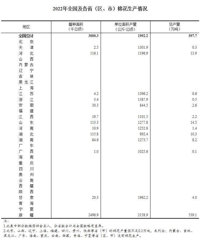 國家統(tǒng)計(jì)局26日公布數(shù)據(jù)顯示,根據(jù)對(duì)全國31個(gè)省(區(qū)、市)的統(tǒng)計(jì)調(diào)查(新疆棉花播種面積通過遙感測(cè)量取得),2022年全國棉花播種面積4500.4萬畝,比上年減少41.8萬畝,下降0.9%;單產(chǎn)132.8公斤/畝,比上年增加6.6公斤/畝,增長5.3%;產(chǎn)量597.7萬噸,比上年增加24.6萬噸,增長4.3%。
