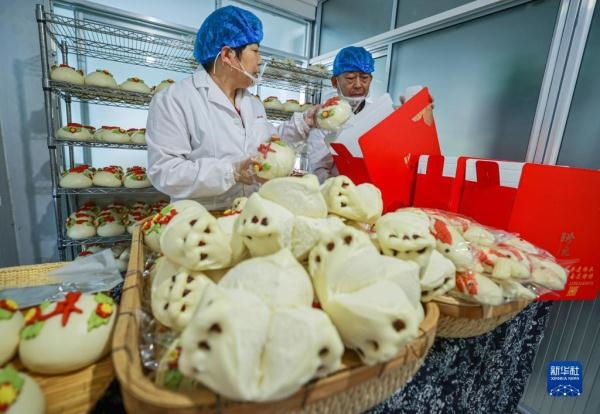 1月11日,在榮成市崖頭街道玉龍社區(qū)一處花餑餑制作坊,工作人員在擺放蒸制好的花餑餑。新華社發(fā)(李信君 攝)
