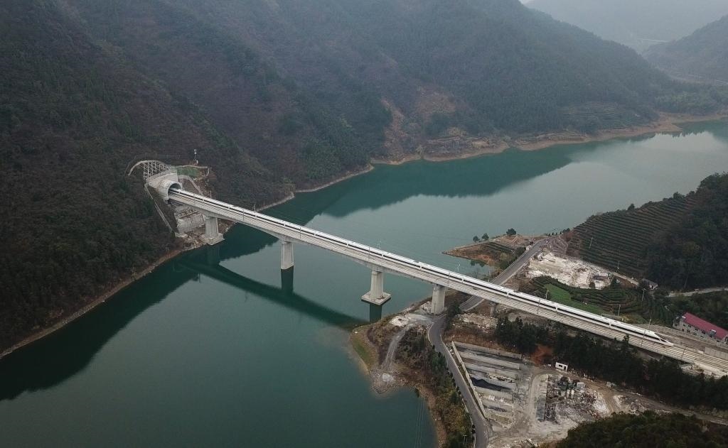 圖為“復興號”列車行駛經過杭黃高鐵位于浙江淳安的進賢溪大橋(無人機拍攝)。新華社記者 黃宗治 攝