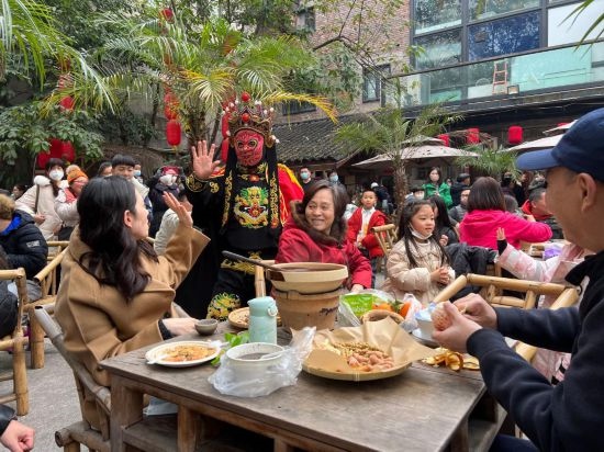 春節(jié)期間,重慶市渝中區(qū)山城巷中,“山城壩壩”茶館的院壩內(nèi)坐滿了客人。人們一邊圍爐煮茶,一邊欣賞臺(tái)上的傳統(tǒng)藝術(shù)表演,川劇變臉演員剎那間切換臉譜,贏得滿堂喝彩。老板舒蓉?zé)崆檎泻糁腿耍瑢⒉杷?、點(diǎn)心端到桌上,忙得不亦樂乎。“今年春節(jié)的客流量遠(yuǎn)超預(yù)期,營業(yè)額是去年同期的七八倍?!?/p>