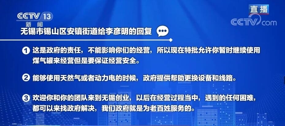 白巖松:首先我們來看看安鎮(zhèn)街道給李彥明的回復(fù)當(dāng)中的一些關(guān)鍵詞,第一個(gè),這是政府的責(zé)任,不能影響你們的經(jīng)營。第二個(gè)里頭包括能夠使用天然氣或者動(dòng)力電的時(shí)候,政府提供幫助更換設(shè)備和線路。在第三里頭有我們政府就是為老百姓服務(wù)的。咱們接下來馬上連線一下當(dāng)事人,無錫市錫山區(qū)安鎮(zhèn)街道商務(wù)科的科長(zhǎng)鄒祎,就是他幫著辦的這個(gè)事情。鄒科長(zhǎng)您好!您當(dāng)然感受得到您火了,在網(wǎng)上也被網(wǎng)友表揚(yáng),我特別想知道您的領(lǐng)導(dǎo)表揚(yáng)您沒有?