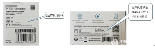5.46款樣品有36款明示了生產(chǎn)執(zhí)行標(biāo)準(zhǔn),10款未明示生產(chǎn)執(zhí)行標(biāo)準(zhǔn)。明示的標(biāo)準(zhǔn)絕大多數(shù)為企業(yè)標(biāo)準(zhǔn),少數(shù)為已過時(shí)效期的行業(yè)標(biāo)準(zhǔn),或與數(shù)據(jù)線產(chǎn)品無(wú)相關(guān)性的安全標(biāo)準(zhǔn)。