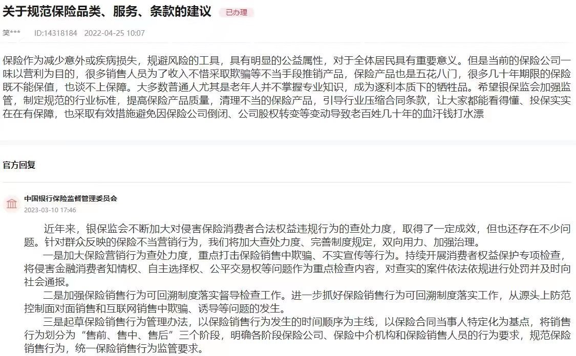 針對這一現(xiàn)象,有網(wǎng)友在人民網(wǎng)“領導留言板”欄目留言表示,希望銀保監(jiān)會加強監(jiān)管,制定規(guī)范的行業(yè)標準,提高保險產(chǎn)品質(zhì)量,清理不當保險產(chǎn)品,引導行業(yè)壓縮合同條款,讓大家投保有實實在在的保障。