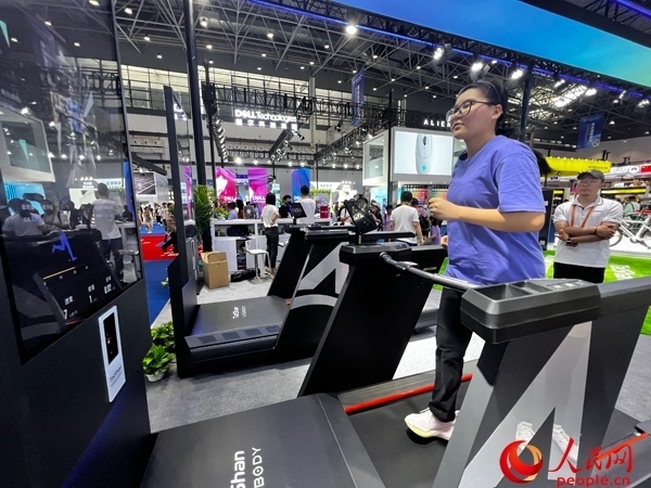 觀眾在消博會(huì)現(xiàn)場(chǎng)體驗(yàn)3D智能專業(yè)跑步機(jī)。人民網(wǎng)記者 張力洋攝