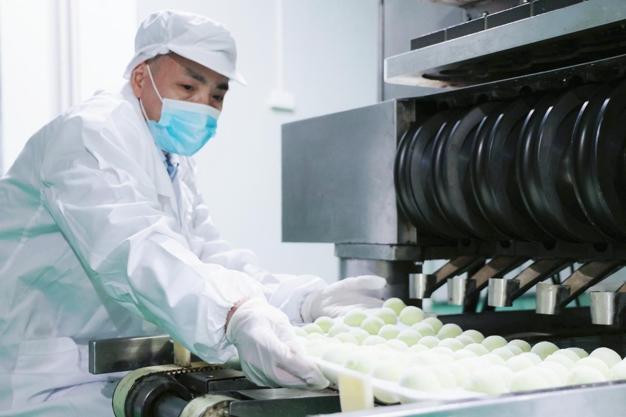在無錫孫府食品有限公司生產(chǎn)車間,工人正在制作青團(tuán)。受訪者供圖