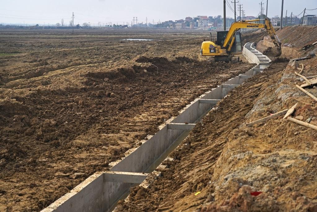 2月21日,施工人員在江西省南昌市新建區(qū)象山鎮(zhèn)高標(biāo)田建設(shè)現(xiàn)場(chǎng)加固灌溉渠。新華社記者 萬象 攝